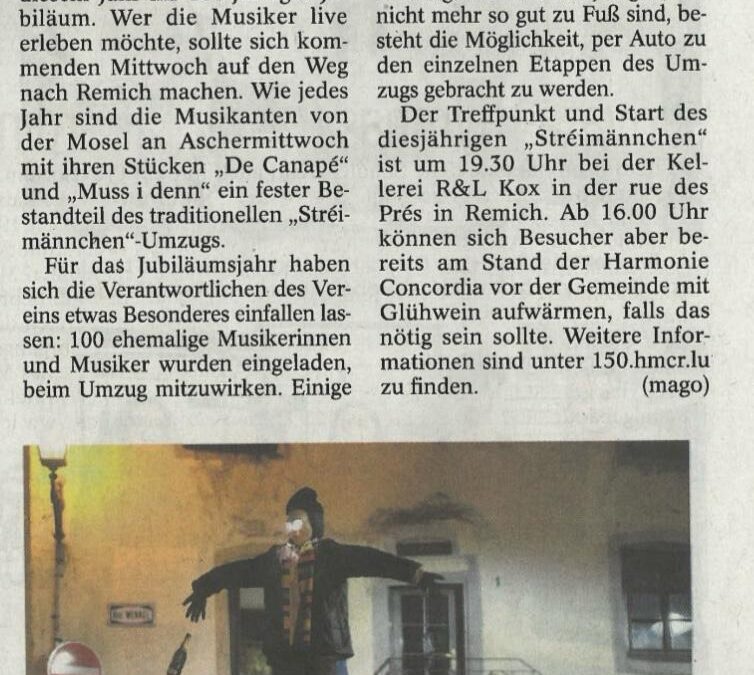 E Méindeg zesummen gebaut ginn, nëmmen fir zwee Deeg duerno verbrannt ze ginn. Dem Réimecher Stréimännchen seng Liewensdauer ass net immens laang. Dëst ass awer elo scho Traditioun zanter 1821. D’Lisa Weisgerber war bei de Preparatiounen a beim Brennen vum...
